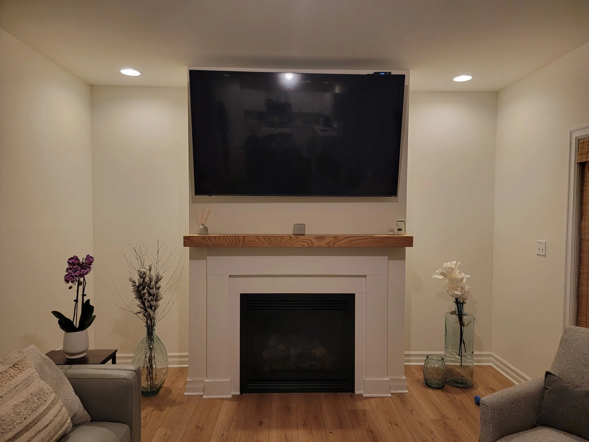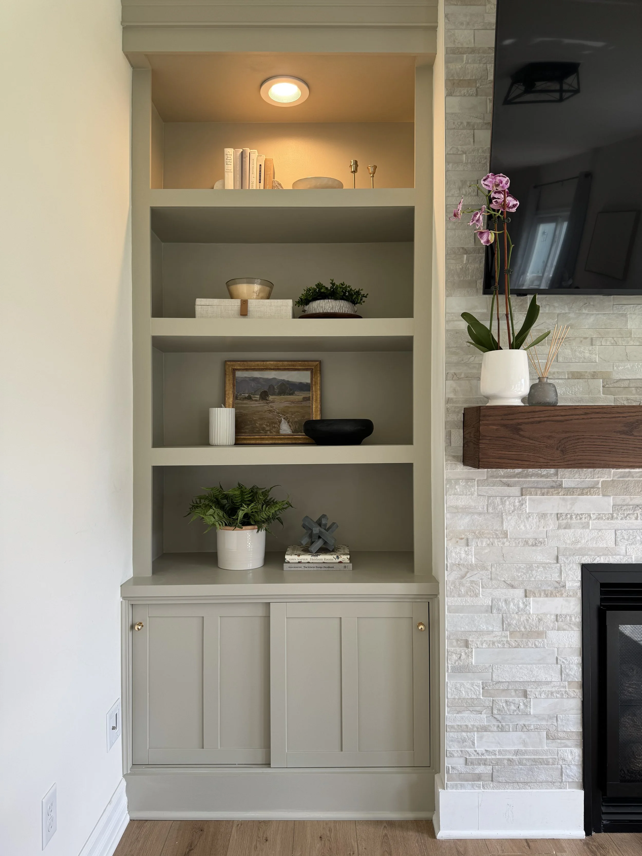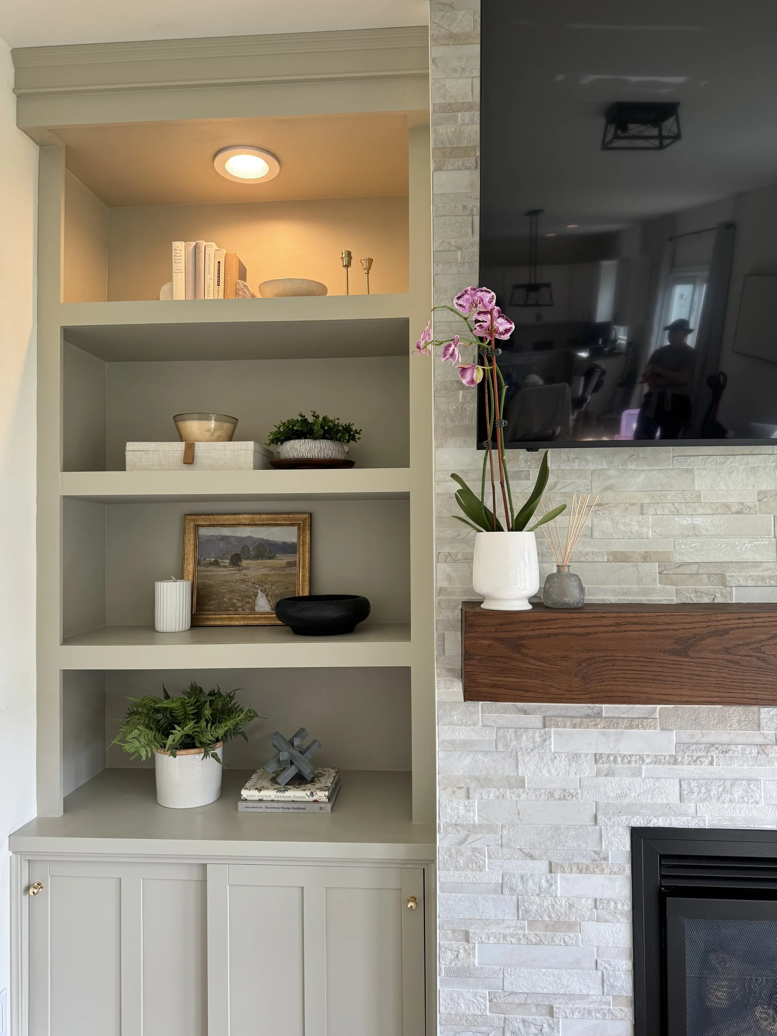 The soft, neutral cabinetry frames the space while offering ample storage below and open shelving above—ideal for curated styling that reflects the homeowner’s personality. A subtle stone façade adds texture and warmth, contrasted by a modern wood mantle for a clean yet inviting focal point.