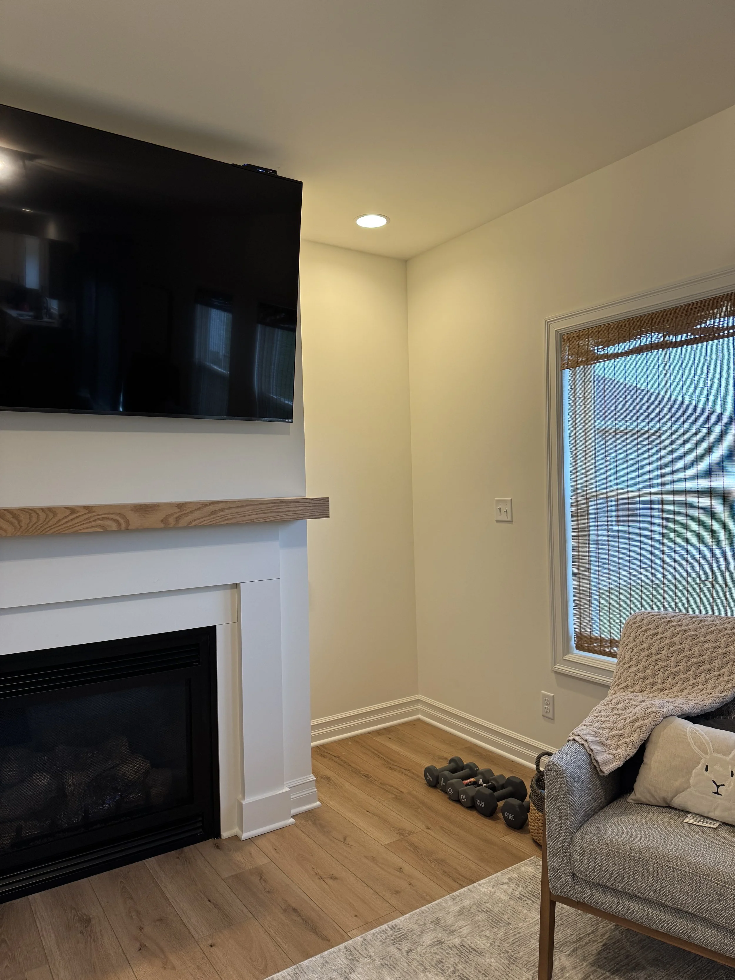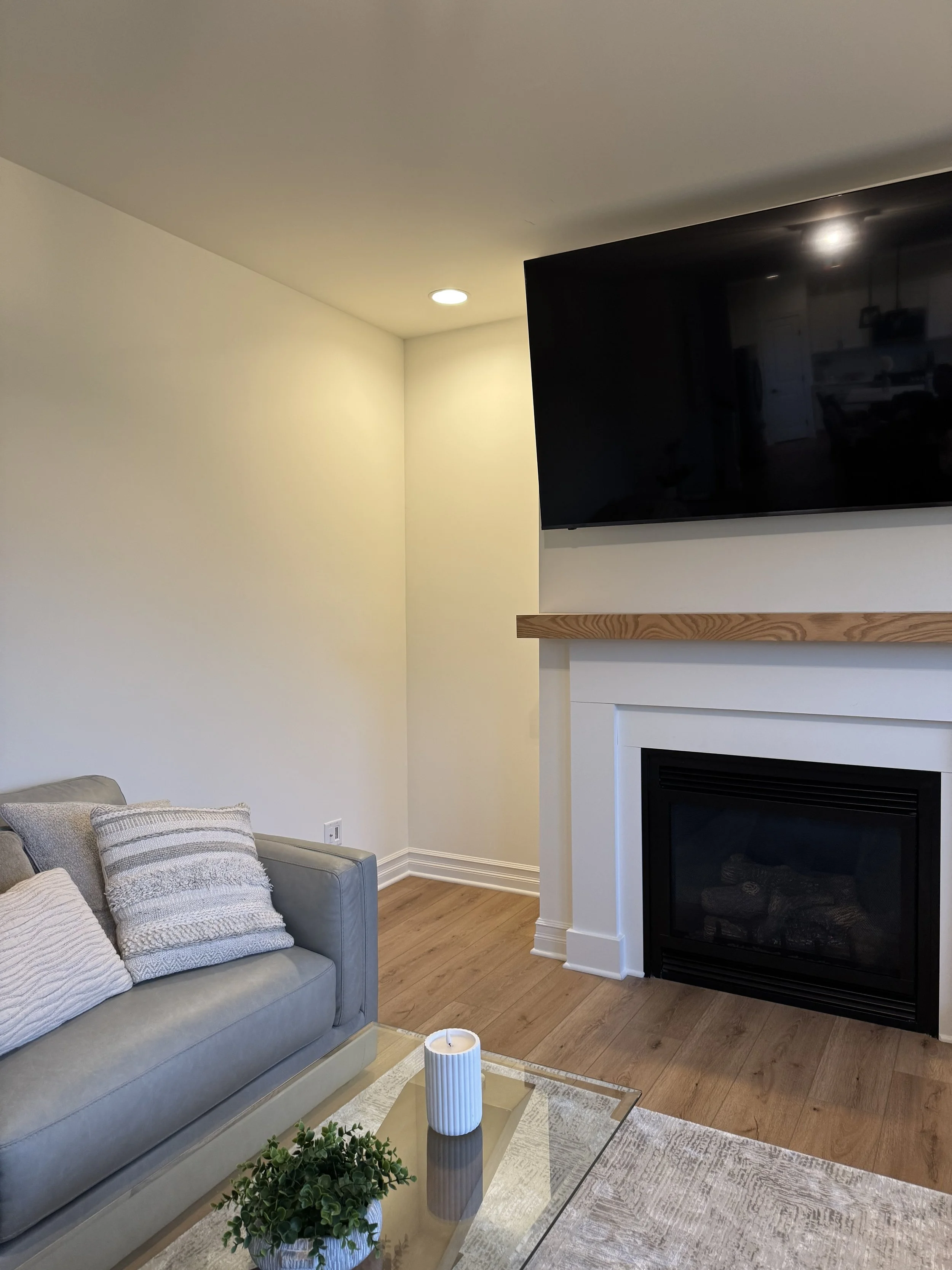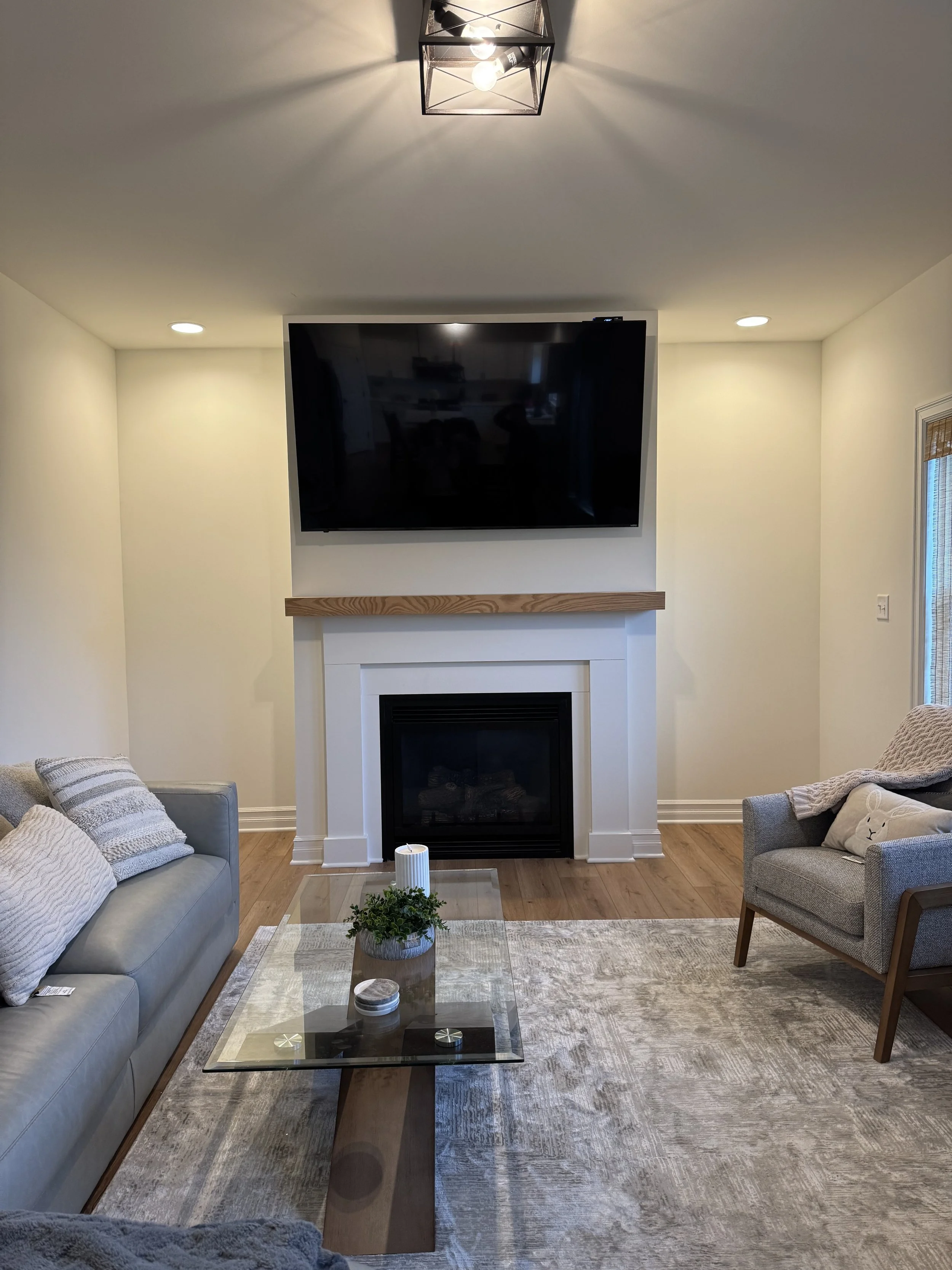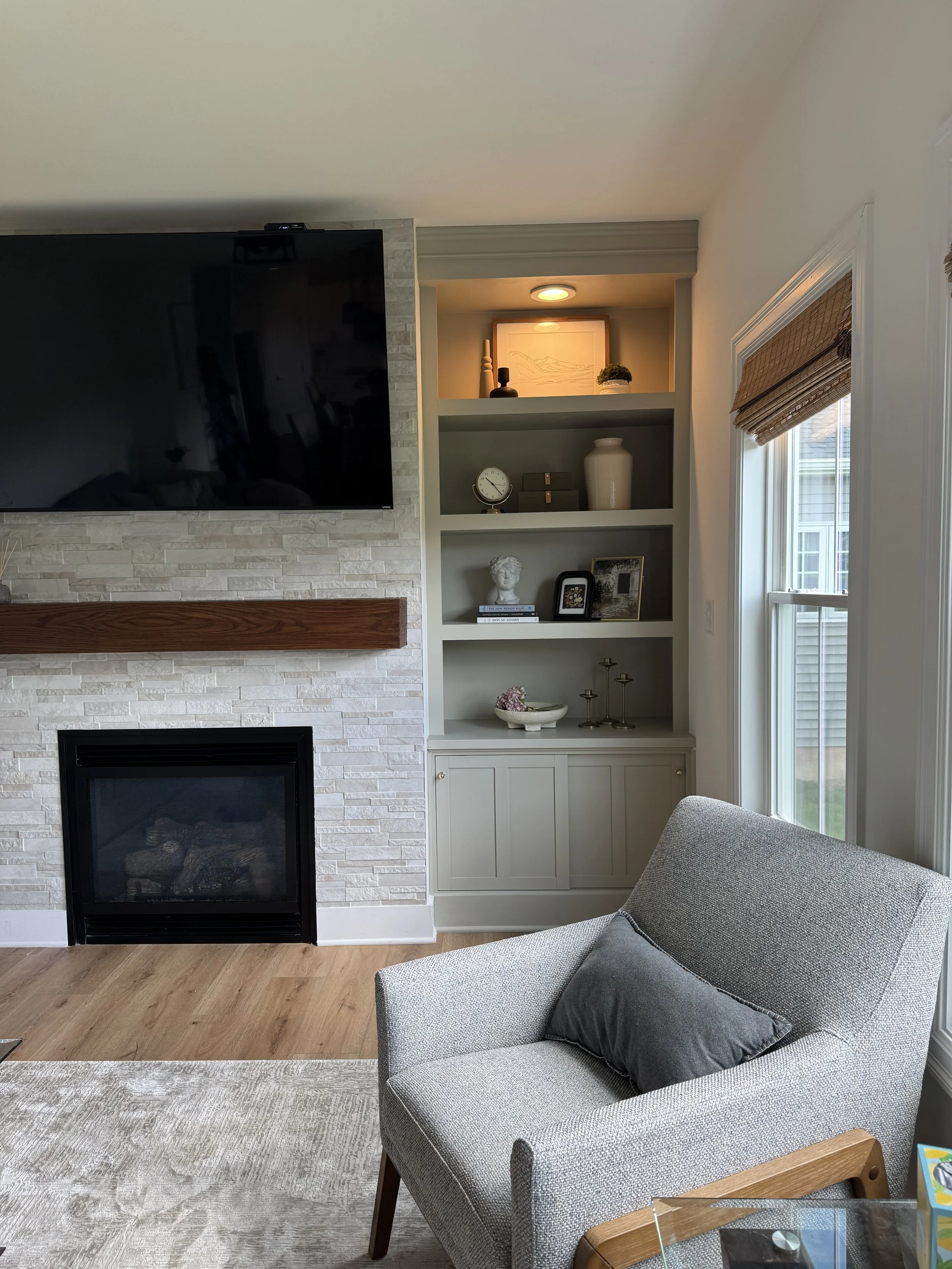 Welcome to one of our favorite living room builds! We designed this space to be both cozy and functional, with built-in shelves that frame the fireplace and make the TV feel right at home. The soft lighting brings a warm glow to the display pieces, and the stacked stone surround adds just the right amount of texture. We kept the palette neutral and inviting, with lots of natural light and comfy seating to make it the perfect spot to kick back and relax.