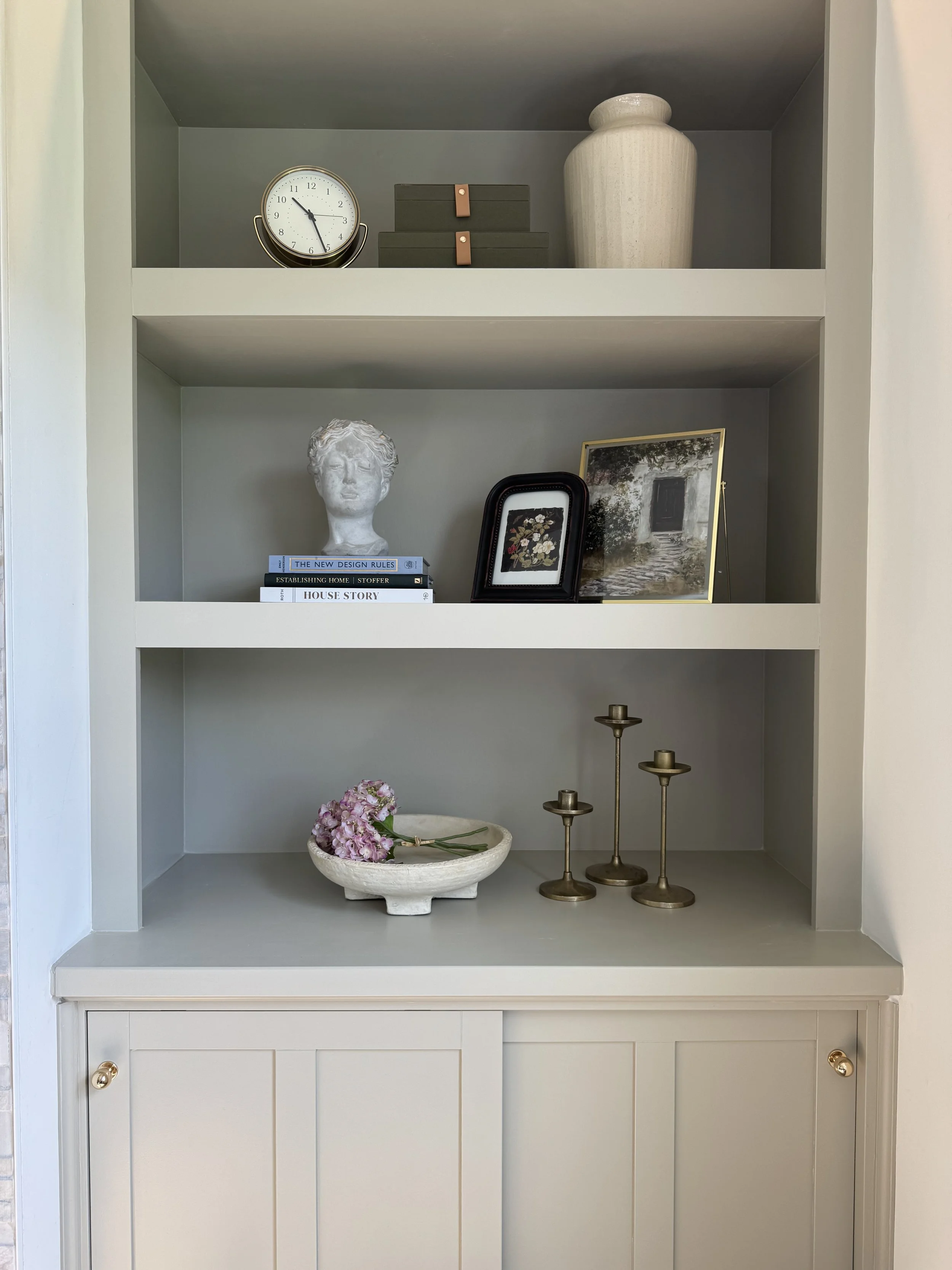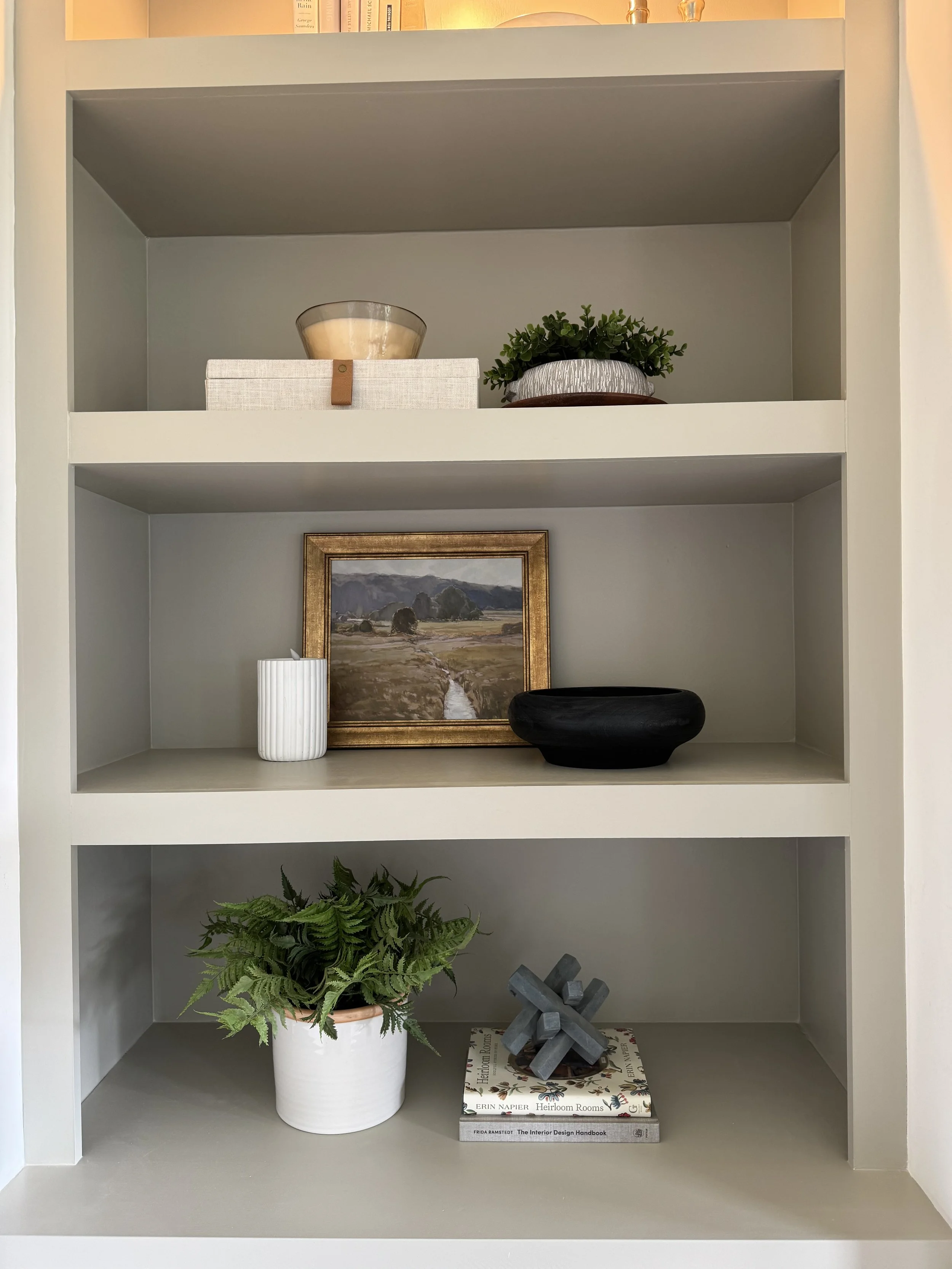 Each shelf is carefully composed with layered elements—organic textures, sculptural pieces, and meaningful accents—demonstrating our belief that styled shelving should both elevate a space and speak to the people who live in it.