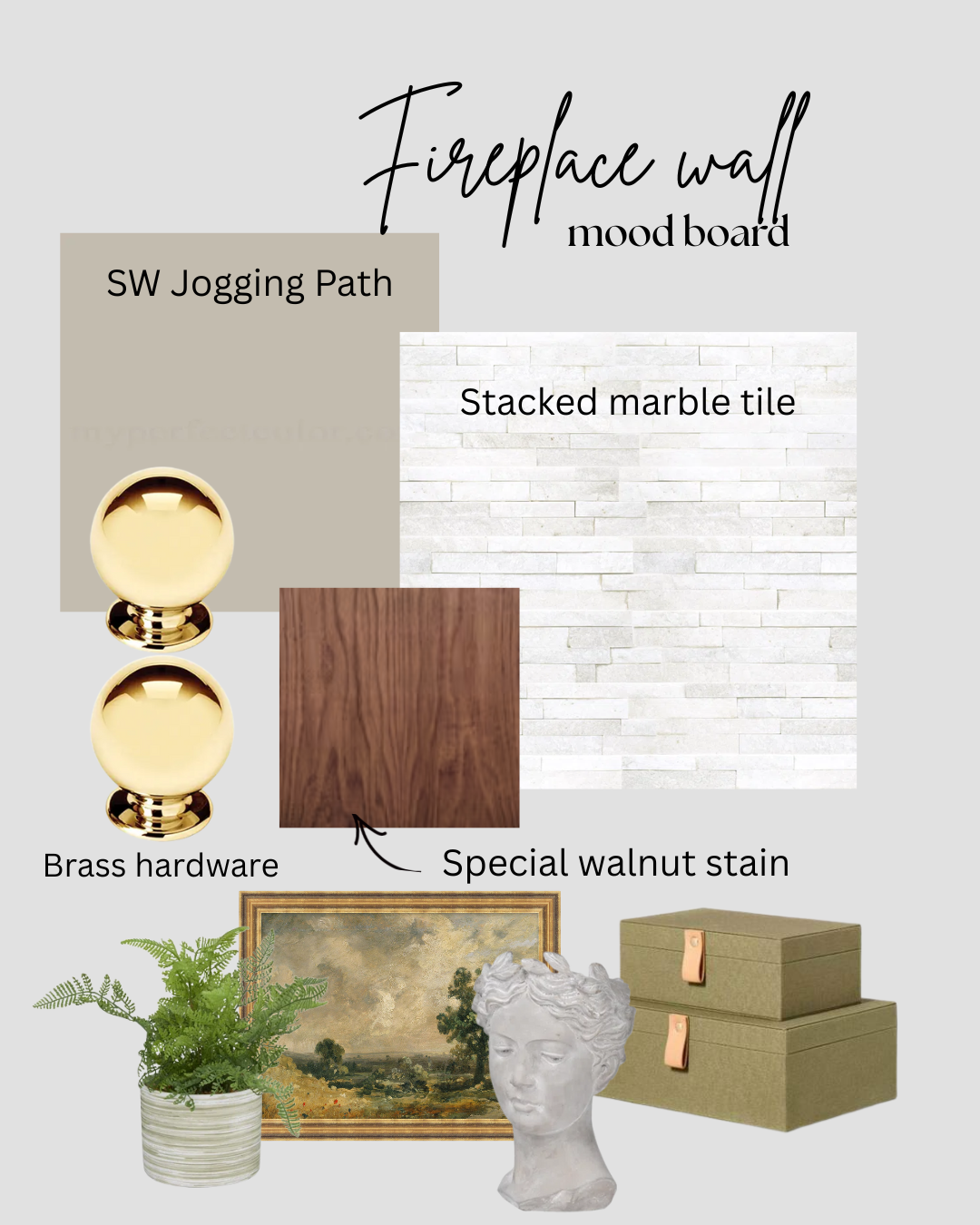 This was our mood board with all the finishes: darker wood stain, a muted green for the built-ins and stacked marble tile for the fireplace, with brass hardware to add depth and interest.